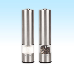 Elektrický mlýnek na sůl a pepřVyroben z nerezové oceliJednoduché ovládání stiskem tlačítkaKeramické mlecí kamenyMožnost nastavení hrubosti mletíprůhledný zásobníkOsvětlení prostoru pod mlýnkemNapájení: 6V stejnosměrné(4 ks 1,5 V baterie velikost AA)Výška - 273 mm, průměr - 50 mm