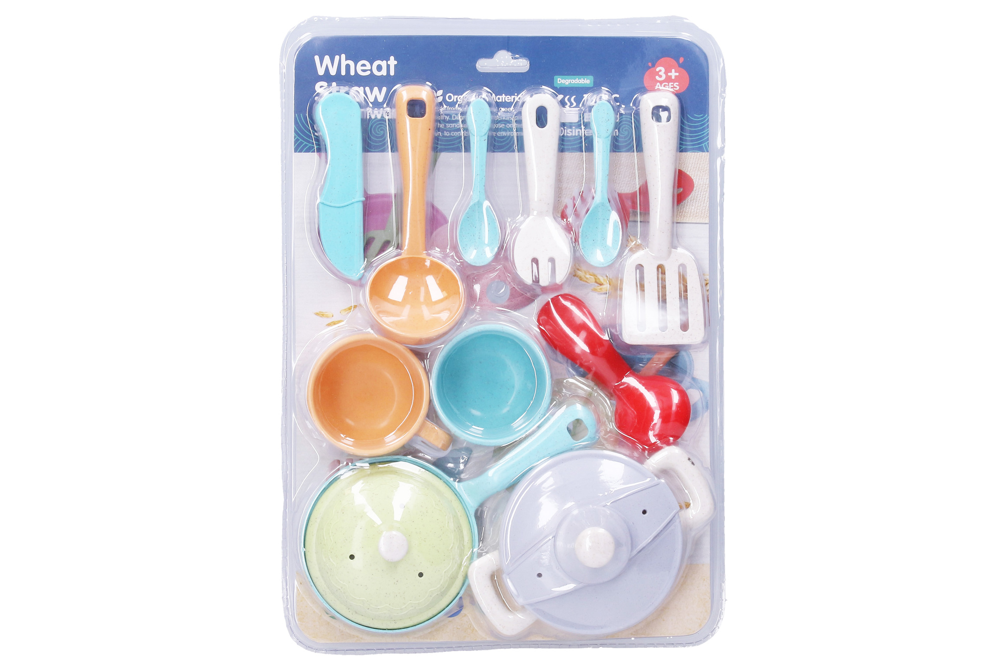 Kuchyňské nádobí Organic. Hrnec s poklicí, pánvička s poklicí, 2 šálky, 2 naběračky, nůž, vidlička, 2 lžíce, kartáč.
