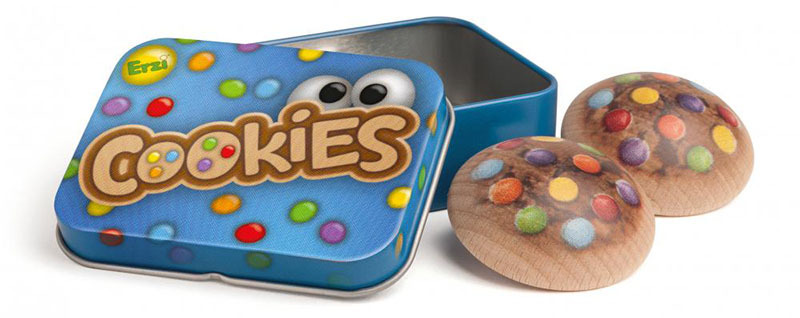 Produkty spożywcze z drewna marki Erzi są uwielbiane przez maluchy ze względu na możliwość realistycznej zabawy w dorosłych. Drewniane ciastka Erzi Cookies in a Tin to słodka przekąska, która sprawdzi się podczas zabawy w sprzedaż, przyrządzanie wypieków czy dom. Dwa apetycznie wyglądające ciasteczka wykonano z solidnego drewna buku. Opakowanie stanowi metalowa, kolorowa puszka. Zabawka została wyprodukowana w Niemczech i posiada certyfikaty CE i ASTM.