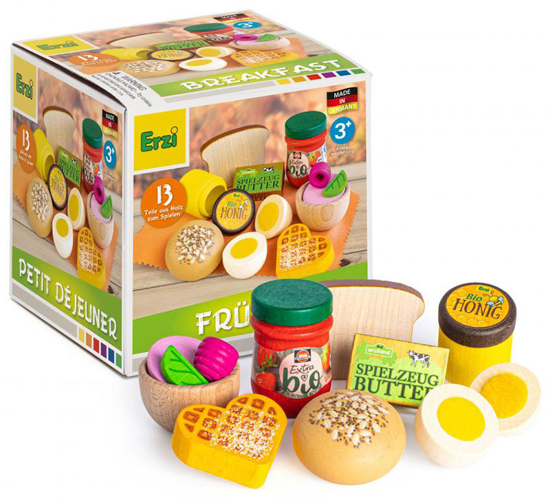 Drewniany zestaw "Śniadanie" marki Erzi pozwoli maluchowi przygotować dla domowników lub zabawek ten najważniejszy posiłek dnia. Każdy z 13 elementów zestawu wykonany został z bezpiecznego i trwałego drewna buku. Żywność do zabawy prezentuje się niezwykle realistycznie, co zapewni ogromną frajdę z zabawy. Zestaw zawiera: 1 bułkę ziarnistą, 1 kromkę chleba tostowego, 1 waflowy gofr w kształcie serca, 1 kostkę masła, 1 dżem truskawkowy firmy Schwartau, 1 słoik miodu, 2 połówki jajek do krojenia (z rzepem imitującym żółtko), 1 filiżanka herbaty owocowej, 1 malina, 1 listek mięty.