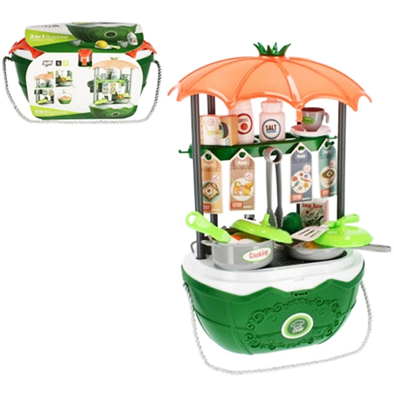 Kuchyňka v košíku, rozměry jsou 22 x 15 cm. Obsah balení: kuchyňka s digestoří, hrnec, pánev, 2 x poklice, 6 x šálek, 4 x talíř, zelenina a ovoce, příbory na vaření. Cena je za kus. Vhodné pro děti 3+.