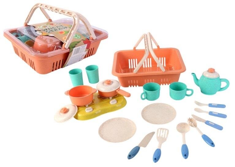 Ekologiczny zestaw kuchenny dla dzieci, wykonany z bio-materiału na bazie słomy pszenicznej, to idealna zabawka dla małych miłośników gotowania i ekologii. Zestaw zawiera koszyk, różne akcesoria kuchenne, talerzyki, sztućce, filiżanki i garnki, które pozwalają na tworzenie różnorodnych scenek podczas zabawy. Wszystkie elementy mają delikatne, naturalne kolory i przyjazny, ekologiczny design. Zabawka uczy dzieci dbania o środowisko i rozwija ich wyobraźnię oraz zdolności manualne, zapewniając przy tym bezpieczną i kreatywną zabawę.