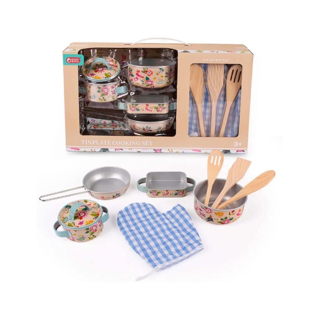 Tento kovový kuchyňský set pro děti zahrnuje všechno, co malý kuchař potřebuje k přípravě imaginárních jídel. Sada obsahuje dva hrnce, pánev, pekáč s držadly, pokličku, kuchyňskou rukavici a tři různé kuchyňské náčiní (lžíce a špachtle). Díky odolnému kovovému provedení set nejen vypadá realisticky, ale také nabízí dlouhou životnost a bezpečnost při hraní.