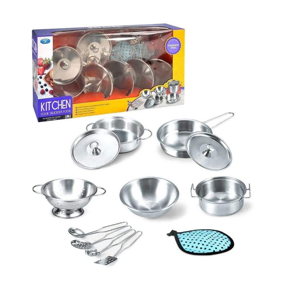 Nasz zestaw kuchenny dla dzieci to fantastyczna zabawka, która przeniesie Twoje dziecko w świat kulinarnej przygody, rozwijając jednocześnie jego kreatywność i umiejętności manualne. Kompletny zestaw metalowych naczyń, zaprojektowany z myślą o małych kucharzach, obejmuje garnek z pokrywką, rondelek, patelnię, durszlak oraz niezbędne akcesoria kuchenne jak łyżka cedzakowa i chochla. Dodatkowo, w zestawie znajduje się także ściereczka, która uzupełnia kuchenny arsenał każdego małego szefa kuchni.