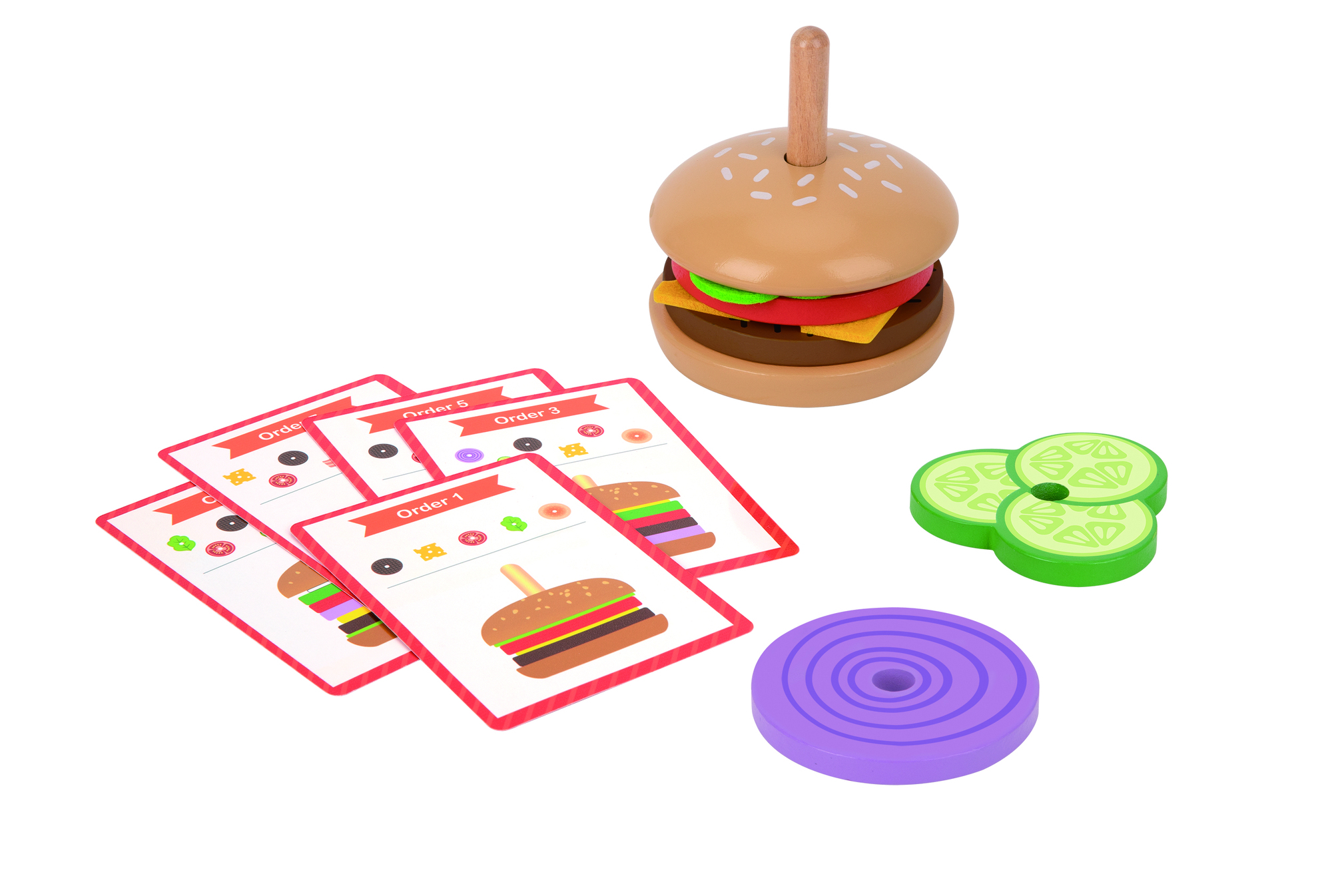 Drevené prísady na burger v podobe zeleninky, mäsa, syru, vajíčka a nesmie chýbať vrchná časť žemle. Všetky sa dajú nasunúť na drevenú základnú tyčku.