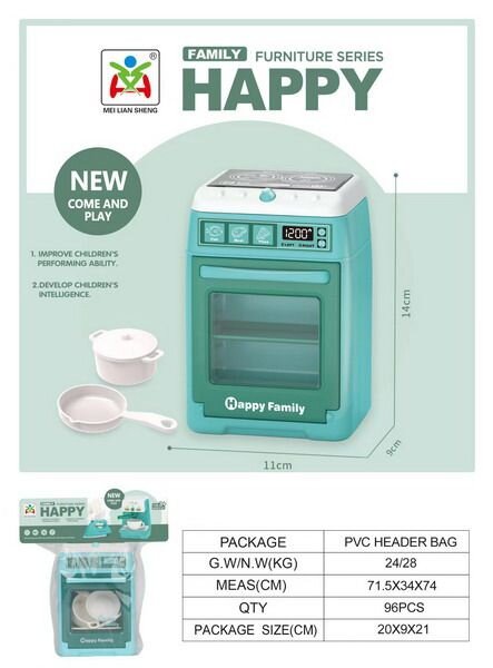 Sporák a trouba s efekty. Velikost 14 cm. Vydává světelné a zvukové efekty. Baterie 3xAA nejsou součástí balení. Přesné rozměry 11x9x14 cm.