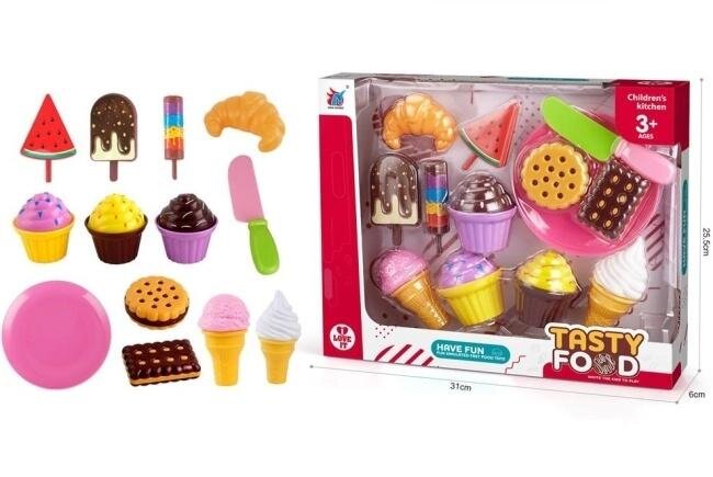 Oczywiście, oto dłuższy opis produktu: Tasty Food Zestaw Kuchenny dla Dzieci - Raj dla Małych Cukierników Przenieś świat wyobraźni Twojego dziecka do kolorowej krainy słodkości z naszym uroczym zestawem kuchennym Tasty Food! Ten bogato wyposażony zestaw to idealna propozycja dla małych kucharzy i cukierników, którzy uwielbiają kreatywną zabawę w naśladowanie dorosłych. W skład zestawu wchodzi cała gama apetycznie wyglądających smakołyków, które zachęcają do zabawy i rozwijają wyobraźnię. Twoje dziecko znajdzie tutaj: Różnorodne lody w rożkach i na patyku, w wielu smakach i kolorach. Urocze babeczki w kolorowych papilotkach, gotowe do udekorowania. Apetycznie wyglądające gofry i ciasteczka o różnych kształtach. Pyszny croissant, idealny na słodkie śniadanie. Soczysty plaster arbuza, dodający letniego klimatu. Aby zabawa była jeszcze bardziej realistyczna, do zestawu dołączono również niezbędne akcesoria: Talerzyk, na którym można serwować przygotowane przysmaki. Bezpieczny, plastikowy nóż i łopatka, idealne do krojenia i nakładania. Zestaw Tasty Food to nie tylko świetna zabawa, ale również doskonały sposób na rozwijanie zdolności manualnych, koordynacji wzrokowo-ruchowej oraz kreatywności. Dziecko może wcielać się w rolę cukiernika, organizować przyjęcia dla swoich lalek i misiów, a także uczyć się dzielenia i współpracy podczas zabawy z innymi. Wykonany z bezpiecznych i trwałych materiałów, zestaw jest przeznaczony dla dzieci powyżej 3 roku życia. Żywe kolory i realistyczny wygląd elementów z pewnością zachwycą każde dziecko i zapewnią długie godziny wciągającej zabawy. Podaruj swojemu dziecku radość tworzenia i smakowitej zabawy z zestawem kuchennym Tasty Food! To idealny prezent na każdą okazję.