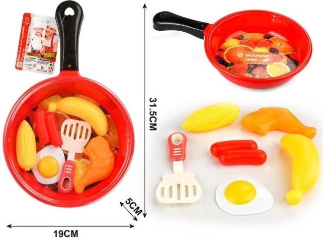 Wspaniały Zestaw do Zabawy w Gotowanie - Czerwona Patelnia z Bogatym Wyposażeniem (7 Elementów) Rozbudź kulinarną wyobraźnię Twojego dziecka dzięki temu fantastycznemu zestawowi do zabawy w gotowanie! Zestaw zawiera realistycznie wyglądającą, czerwoną patelnię (z rączką), idealną do przygotowywania pysznych, wymyślonych posiłków. W komplecie znajduje się aż 6 dodatkowych akcesoriów, które urozmaicą zabawę. Mali kucharze znajdą tu między innymi: Soczystą kukurydzę. Apetycznego kurczaka. Dwie smakowite parówki. Smażone jajko z żółtkiem. Jasnożółtego banana. Praktyczną łopatkę kuchenną. Wykonane z bezpiecznych materiałów, te kolorowe elementy doskonale imitują prawdziwe jedzenie i przybory, zapewniając długie godziny kreatywnej zabawy. Ten zestaw to doskonały pomysł na prezent, który zachęci dzieci do odgrywania ról i rozwijania wyobraźni.