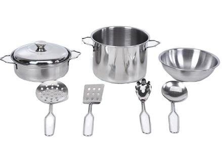 Naše kovové nádobí je vyrobeno z kvalitní leštěné nerezové oceli, zajišťující dlouhou životnost a bezpečnost při hře. Set obsahuje vše potřebné pro kuchyňské dobrodružství: hrnec s pokličkou, objemný rendlík, praktickou misku a čtyři nezbytné kuchyňské pomůcky - cedníkovou lžíci, lopatku s otvory, lžíci na těstoviny a naběračku. Tyto miniatury skutečného nádobí umožní dětem rozvíjet představivost, motoriku i sociální dovednosti při společné hře s kamarády nebo sourozenci.