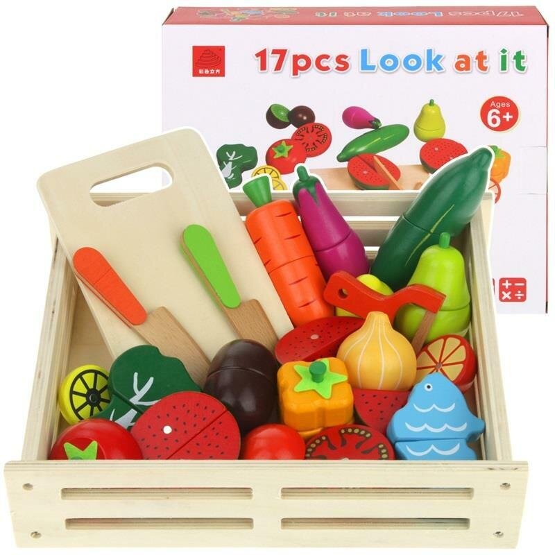 Każdy mały kucharz będzie mógł się bawić, uczyć i rozwijać. Prezentowany kolorowy zestaw zapewni kreatywną zabawę, dzięki której dziecko będzie mogło kroić i porcjować swoim nożem owoce i warzywa jak prawdziwe. Dziecko dzięki zabawie ćwiczy zdolności motoryczne, wyobraźnię i kreatywność. Dodatkowo uczy się ich nazw, wyglądu i kształtu. Klocki łączone są ze sobą za pomocą magnesu.W zestawie znajdują się 34 elementy:- owoce: gruszka, kiwi, arbuz, pomarańcza, cytryna- warzywa: pomidor, ogórek, cebula, marchewka, dynia, brokuł, bakłażan- ryba- 2 noże- obieraczka- deska do krojenia- skrzynkaOdpowiedni wiek: 6 lat+Długość pojedynczego elementu zestawu: od 1 do 6,5 cmDługość noża: 12,5 cmDługość obieraczki: 7 cmWymiary deski do krojenia: 11 (szer.) x 0,5 (gł.) x 17 (wys.) cm Wymiary skrzynki: 28 (szer.) x 23,5 (gł.) x 6,5 (wys.) cmWymiary opakowania: 30 (szer.) x 7,5 (gł.) x 24,5 (wys.) cmInformacja od producenta: Nie nadaje się dla dzieci w wieku poniżej 36 miesięcy. Zawiera małe części, które łatwo połknąć lub które mogą się dostać do dróg oddechowych. Niebezpieczeństwo uduszenia.