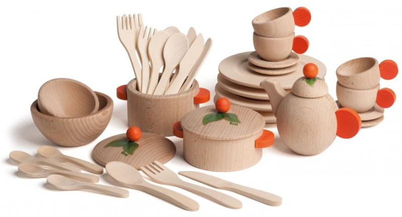 Kompletny zestaw kuchenny wykonany z naturalnego drewna bukowego. Zawiera garnki, miski, czajniczek, talerze, filiżanki oraz pełen komplet sztućców dla 4 osób. Idealny do zabawy w gotowanie i serwowanie posiłków. Wspiera rozwój motoryki i kreatywność dziecka.
