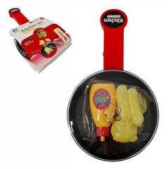 Zestaw kuchenny na patelni z akcesoriami: sos, rybka, kawałek mięsa, kiełbaski i dodatki. Zapakowany na blistrze. Zabawka przeznaczona dla dzieci od lat 3. Produkt działa na baterie typu AA. Baterie nie są załączone do zabawki.