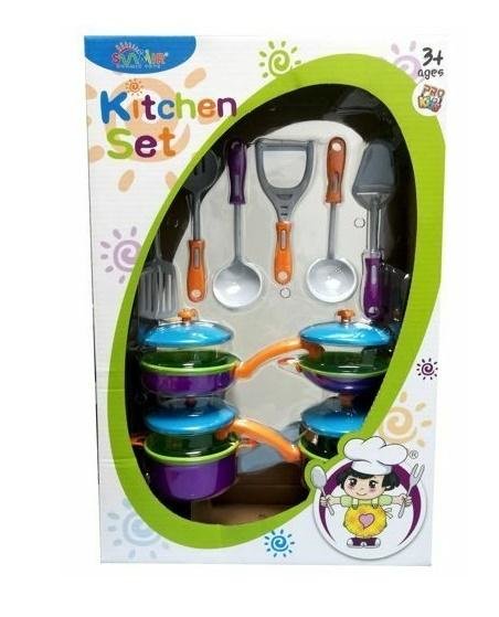 Zabawka dla dzieci w wieku 3+. W zestawie znajdują się: czajniczek, 2 garnki, patelnia, wok wszystko z przykrywkami, nóż, widelec, obieraczka, chochla, durszlak i tarka. Pakowanie w open box, w którym z obu stron można widzieć produkty.