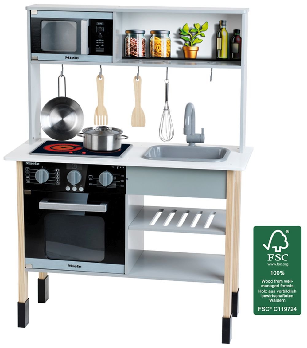 Dětská kuchyně, Miele, dřevo (MDF), bílá, midi, 70x 30 x 91 cm. - Varná deska se zvukem a funkcí duálního světla - Kamna - Mikrovlnná trouba - S vysoce kvalitním kovovým a dřevěným příslušenstvím (hrnec s víkem, pánví, šlehací metlou a 2x vařečkou ) - S odnímatelným dřezem Vhodné pro děti od 3 let