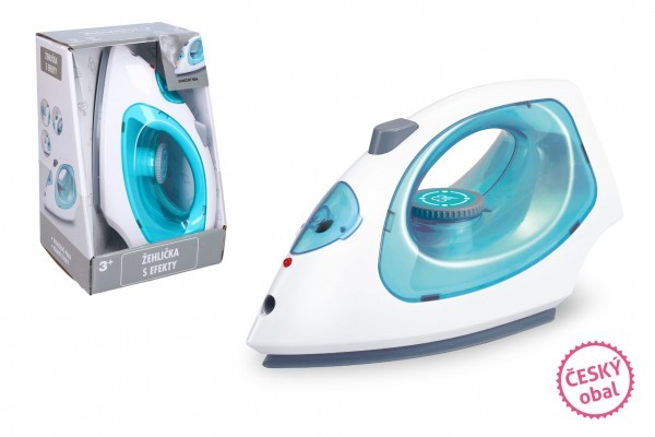Žehlička vypouštějící páru plast 22cm na baterie se zvukem a se světlem v krabici 16x23x14cm
