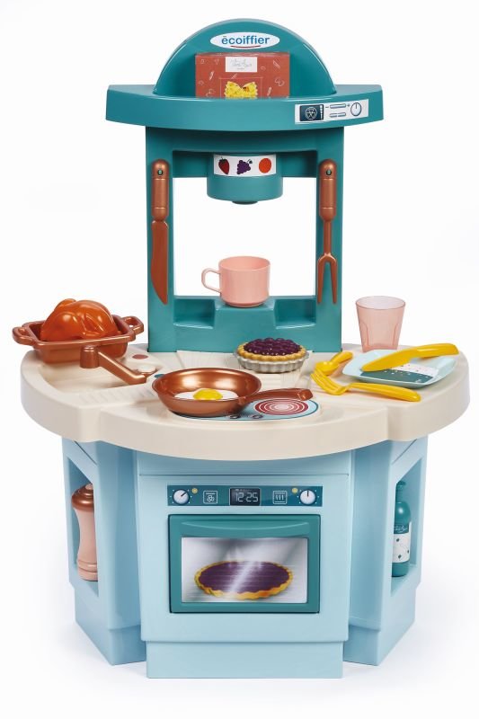 Kompaktní kuchyňka v azurové barvě na hraní má troubu, sporák se dvěma hořáky, dřez s kohoutkem a různé police a háčky na uložení příslušenství. Kuchyňské doplňky zahrnují pánev se sázeným vejcem, pekáč se smaženým kuřetem, náčiní na pečení, talíř s příbory, sklenici, hrnek, mlýnek na pepř, krabička na těstoviny, láhev vody a dortík jako dezert. Celkem 18 doplňků. Rozměry kuchyňky (DxŠxV): 43,5 x 27 x 60 cm.