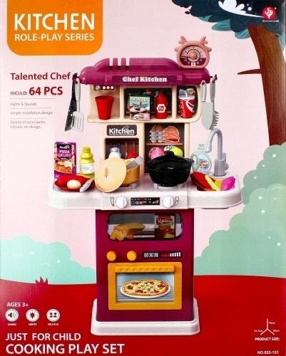 Zalety produktu: posiada efekty dźwiękowe oraz świetlne, płyta wydaje odgłosy gotowania, kurki do sterowania kuchenką są ruchome, zlew posiada kran, kuchnia posiada otwierane drzwi piekarnika, składa się z 64 elementów. Kuchnia MEGA CREATIVE to propozycja ciekawej i wciągającej zabawy dla dzieci, które chętnie naśladują zajęcia dorosłych i w bezpieczny sposób mogą bawić się w małych kucharzy. Ciekawy i nowoczesny design, a także ładna i żywa kolorystyka to tylko niektóre cechy tej kuchni! Zawartość zestawu: kuchnia, 2 x garnki z pokrywką, patelnia, 3 x talerze, kubek z rurką, kubek na napój, wafelki do lodów, szczypce, chochla, nóż, sztućce, imitacja warzyw i produktów spożywczych. Całość wykonana z plastiku oraz kartonu. Wymiary/waga/baterie: wymiary produktu (dł. x wys. x gł.) [cm]: 48x75x25, wymiary opakowania (dł. x wys. x gł.) [cm]: 47x60x11, waga produktu bez opakowania [kg]: 1,70 kg, waga produktu w opakowaniu [kg]: 2,19 kg, wymaga zasilania bateriami 4 x AALR06- nie załączono do zestawu. Zabawka przeznaczona dla dzieci w wieku: 3+. Pakowana w kartonik.