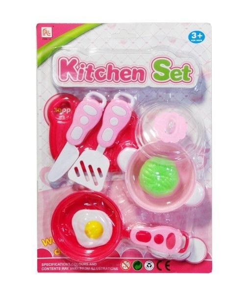 Zestaw kolorowych naczyń i akcesoriów kuchennych dla małej gospodyni domowej, przydatne podczas zabawy w dom. W zestawie można znaleźć m.in.: garnek i patelnię z pokrywką, deskę, a także akcesoria kuchenne np.: nóż, cedzak. Produkt zapakowany w kartonową podstawkę z przezroczystym kloszem. Produkt dla dzieci od 3 lat. Podane wymiary są wymiarami opakowania.