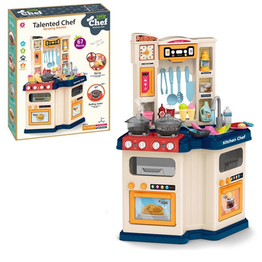Duża kuchnia z akcesoriami - 67 elementów. Lecąca woda, produkt imituje dźwięk gotującej się wody. Efekty świetlne oraz dźwiękowe. Wysokość kuchni 78,5 cm Wymagane baterie - 9xAA (niedołączone)