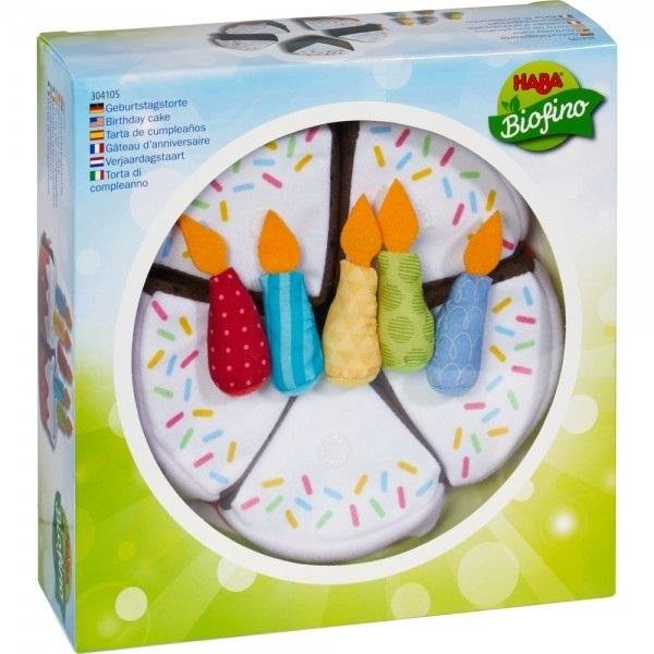 Ten starannie wykonany tort urodzinowy z serii Biofino marki HABA będzie atrakcją każdej kuchni dziecięcej i każdego sklepiku. A wraz z jubilatem będą wspólnie gwiazdami urodzinowej imprezy. Wiernie odwzorowany tort czekoladowy jest wewnątrz brązowy, a z zewnątrz oblany białym lukrem oraz ozdobiony kolorową posypką. Idealnie nadaje się na świętowanie urodzin wśród przyjaciół, ulubionych lalek i przytulanek. Aby móc odgrywać realistyczne sytuacje, tort daje się pokroić na piłę kawałków, można go podać gościom, a następnie złożyć w całość, dzięki przyczepieniu elementów tortu na rzep. Gdy w trakcie zabawy maluchy zapragną także urodzinowych świeczek, na torcie można umieścić piłę kolorowych ozdób, przyczepianych na rzep. Tort jest tak piękny i od wzorujący ten prawdziwy, że pasuje na każdą okazję, nie tylko imprezę urodzinową. Zawartość opakowania: 5 kawałków tortu z pojedynczymi świeczkami.