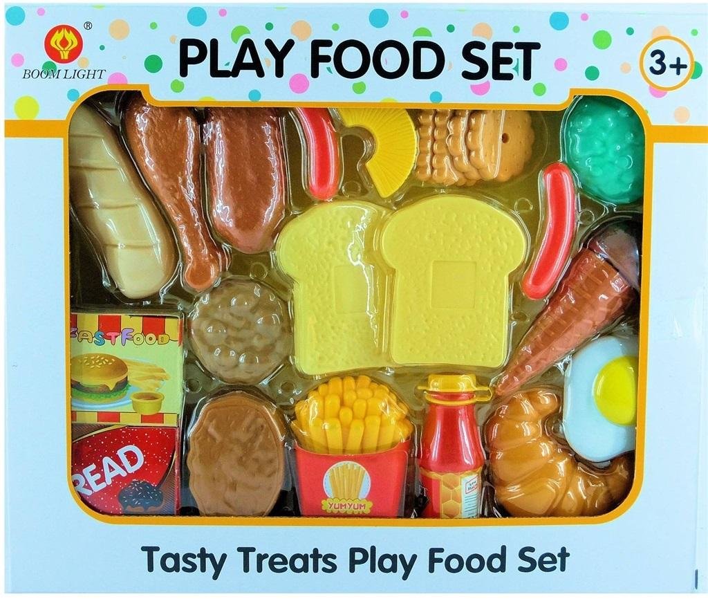 zestaw 24 elementów , do zabawy w kuchni lub, w dom, zawiera jajko , chleb, frytki , burger, napój , ciastka nóżka kurczaka číst celé