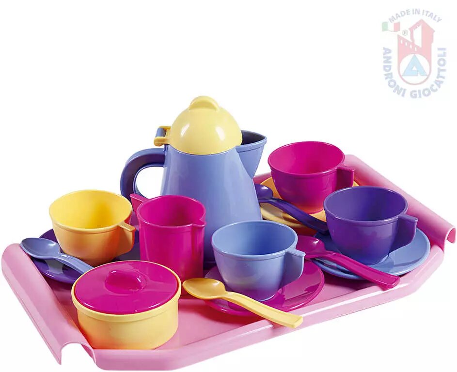 ANDRONI Kávový a čajový set dětské plastové nádobí s podnosem pro holčičky