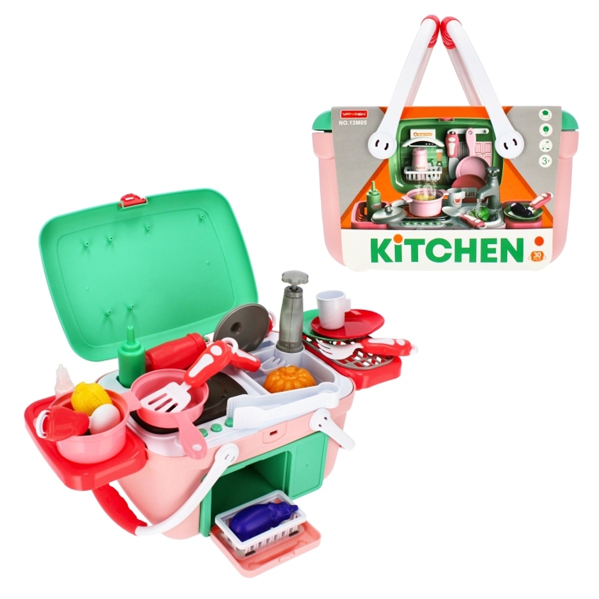 Přenosná kuchyň ve formě koše, má zvukové a světelné efekty, má troubu, kterou lze otevřít, po naplnění nádrže vodou číst celé