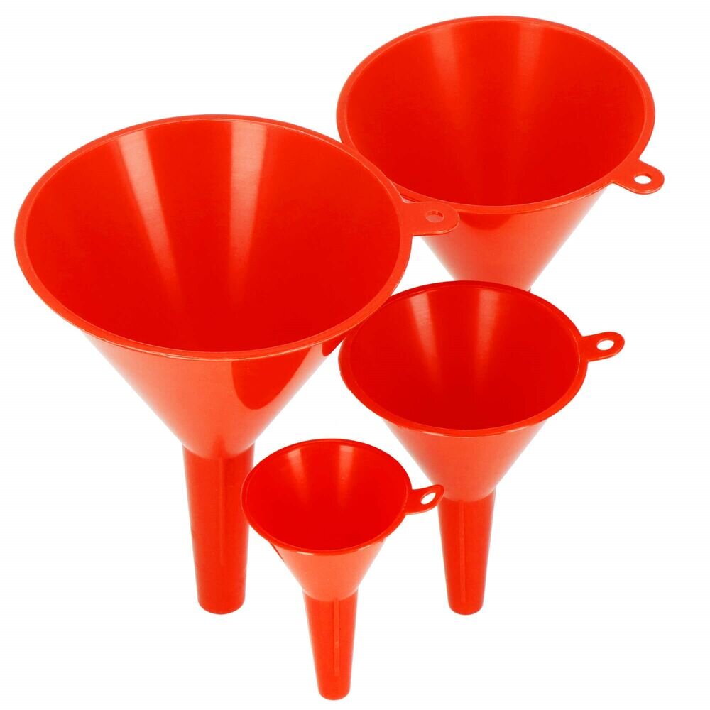 Sada praktických trychtýřů se 4 různými velikostmi. Univerzální použití, dlouhá životnost. Odolný materiál v jasných barvách. Závěsné rukojeti, snadné užívání. Vhodný doplněk do kuchyně, garáže, nebo dílny.