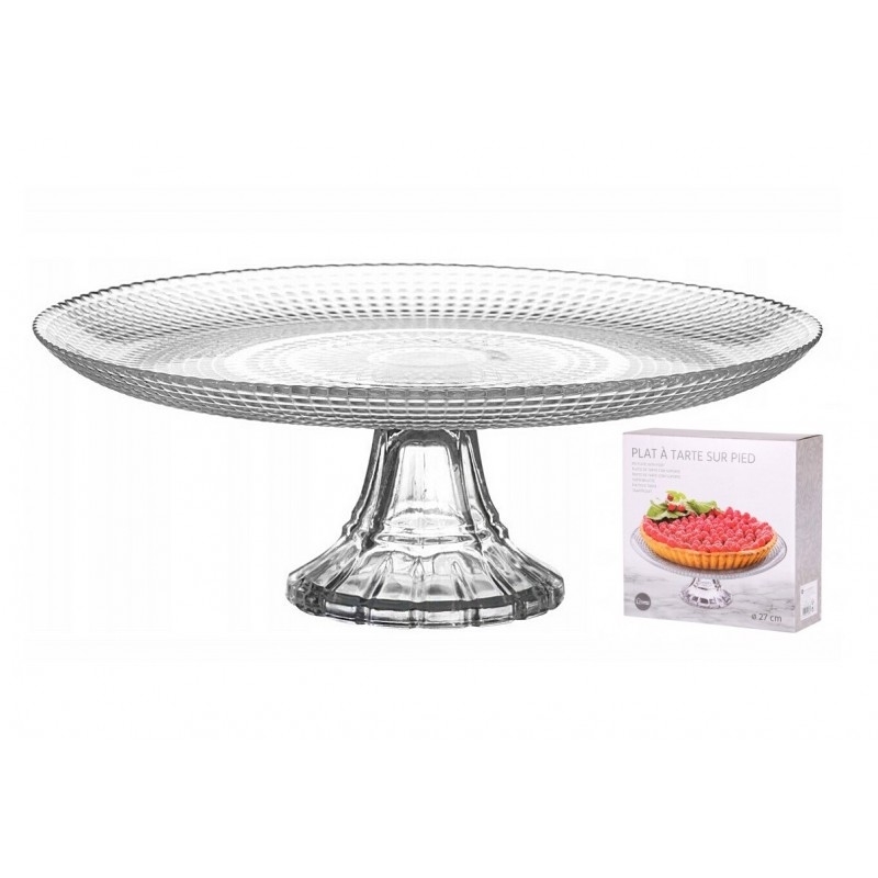Skleněný etažér na noze průměr 27 cm a výška 9.5 cm je vhodný pro servírování dortů, koláčů, chlebíčků, zákusků apod. Stojan na dort je vyrobený ze silného sodovápnitého skla, je odolný zvýšeným teplotám. Vhodný do myčky nádobí. EAN 8693357191761 číst celé