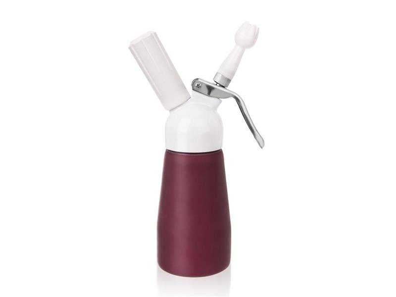 Láhev je vynikající pro přípravu a podávání šlehačky (na 0,1 - 0,2 l šlehačky). K přípravě šlehačky potřebujete buď výměnné nebo jednorázové šlehačkové bombičky s náplní N2O. Šlehačka vyrobená v láhvi na přípravu šlehačky má vynikající chuť, nemusí být slazená, takže jí můžete dotvářet i slané pokrmy a omáčky a je trvanlivější. Můžete přidat vanilkový cukr, holandské kakao, moučkový cukr. Nedoporučuje se používat přísady, které mohou způsobit hrudkování - ztužovač šlehačky, krystalový cukr. Materiál: hliník, plast PP (tryska, uzávěr) plast POM (ventil), silikonové těsnění. Barva vínová/bílá. Hlava je vyrobená z hliníku s bílým nástřikem. Rozměry: celkový objem 0,4 l, pr. 8 cm, v. 21 cm. Skladovat nespotřebovanou šlehačku je možné v lednici při garantované kvalitě 24 hodin. Náhradní těsnění v naší nabídce 180527.