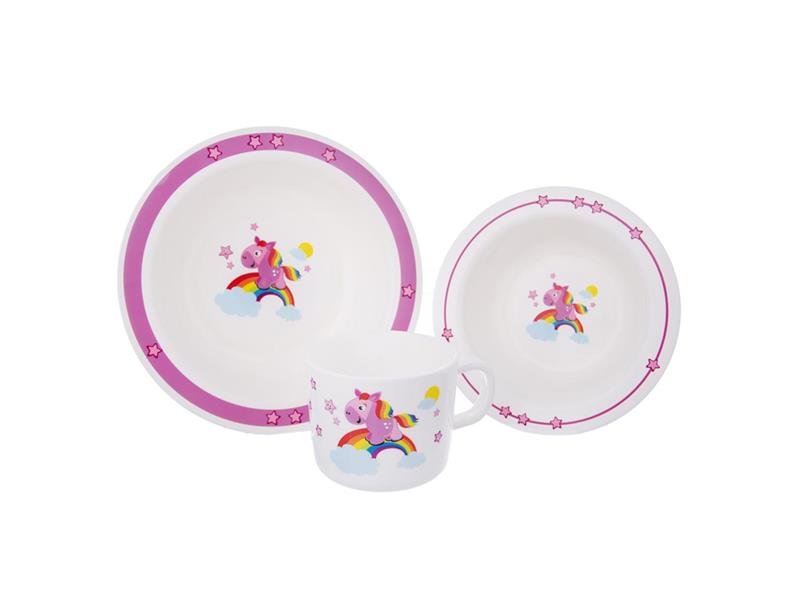 Jídelní sada s dětským dekorem obsahuje dvě hluboké misky a hrneček.