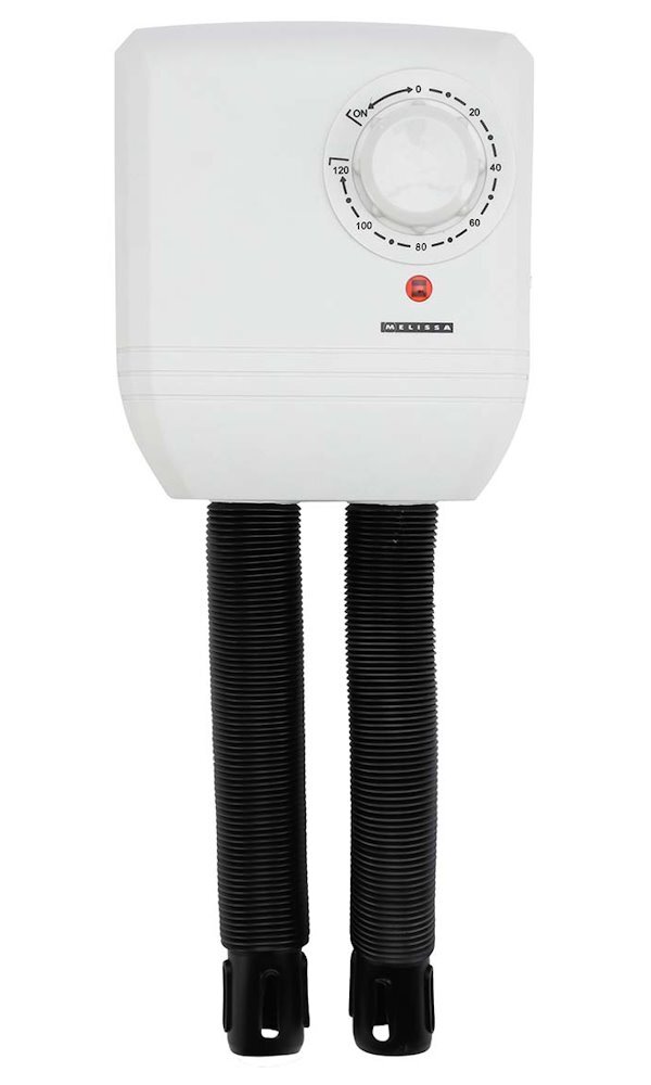 Vysoušeč obuvi o výkonu 250 W s nástěnným držákem je ideální k sušení jednoho páru vlhkých bot nebo holínek. Vzduch o teplotě až 70 °C proudí současně ze dvou vývodů, rychle tak odstraňuje vlhkost a zabraňuje nepříjemnému zápachu a tvorbě bakterií. Vložte hadici do každé boty nebo holínky, nastavte časovač na požadovaný čas a sušička obuvi se postará o zbytek. Zařízení se po uplynutí nastavené doby automaticky vypne. Zabudovaná ochrana termostatu navíc poskytuje ochranu proti přehřátí.