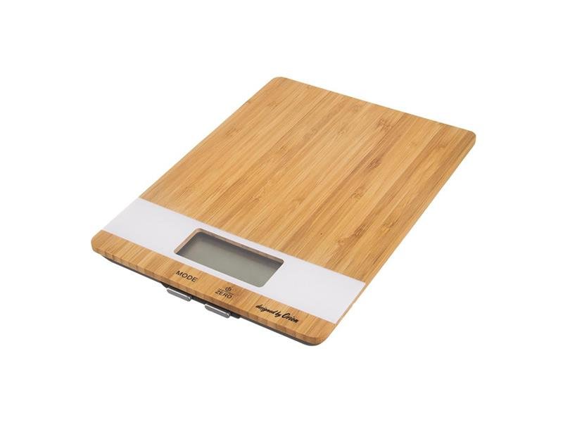 Váha kuchyňská s digitálním LCD displejem. Max na 5 kg. Funkce: vážení v g /lb:oz/ml (pro mléko i tekutiny). Funkce TARE - dovažování. Napájení na 2xAAA 1,5 V (není součástí). Vybavena přesným tenzometrickým snímačem. Materiál: bambusové dřevo, plast. Snadná údržba, skvělý vzhled. Indikátor slabé baterie a přetížení. Automatické vypnutí. Rozměry: 17x23x2 cm.