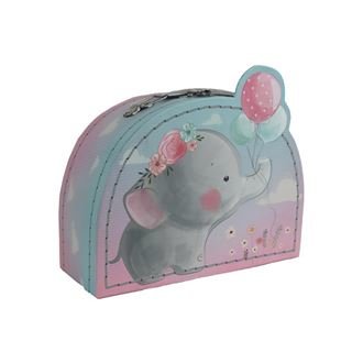 Papírový kufřík.Rozměry : 21,5 × 16 cm, výška 8,3 cm.Barva : kombinace modrá, šedá, růžová.Materiál : papír, kov. číst celé