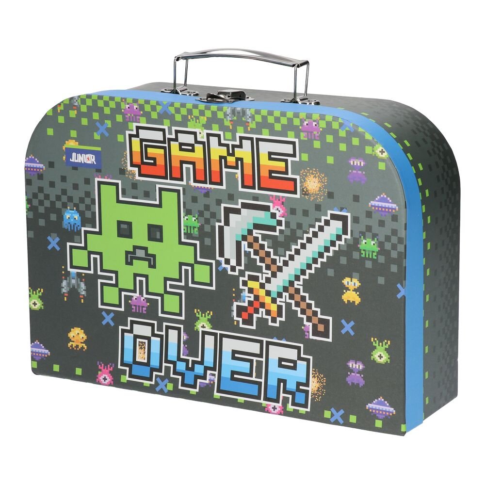 Dětský kufřík "Hra skončila (Game over)" je navržen speciálně pro předškolní děti. Je vyroben z pevných materiálů - kartonu, který zaručuje lehkost i odolnost během používání. Kufřík je vybaven praktickým kovovým zámkem a pevnou rukojetí, díky čemuž je jeho přenášení snadné a bezpečné. Uvnitř kufříku nejsou žádné příčky, což dává prostor pro ukládání různých drobností, hraček nebo třeba výtvarných potřeb. Díky svému designu podporuje organizaci a zároveň je skvělým doplňkem pro děti během cest či stánek her.