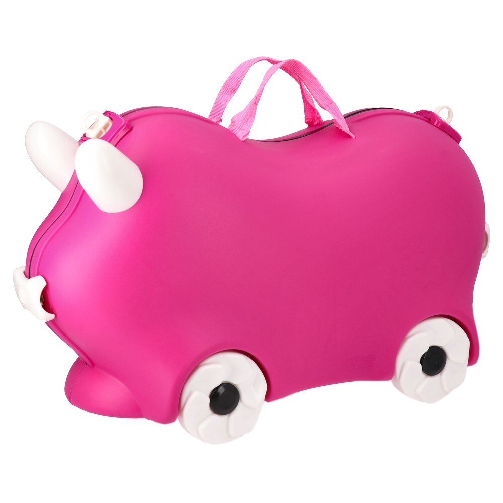 Detský cestovný kufrík s kolieskami možno ťahať, sadnúť si naň a odrážať sa nohami alebo niesť.