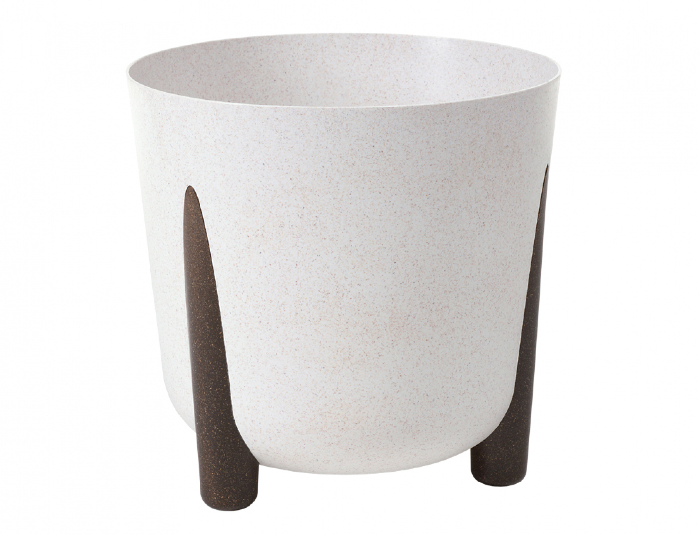 Originální design na třech nožkách dodává květináči nejen stabilitu, ale i jemný estetický vzhled. Obal je vyroben z plastu obohaceného o až 40 % dřevěných štěpek, které pocházejí z dřevozpracujícího průmyslu. Díky tomu je jeho výroba šetrnější k přírodě a zároveň získává přírodnější, zemitý vzhled, který krásně doplní jak vnitřní prostory, tak zahradu.