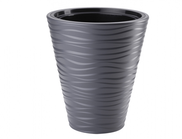 Vysoký plastový obal na květník s vnitřní vložkou. Je vhodný do interiéru i venkovních prostor. Obal je vyroben z lehkého plastu a je odolný vůči UV záření i vůči mrazu. Průměr: 40 cm, výška: 44 cm.