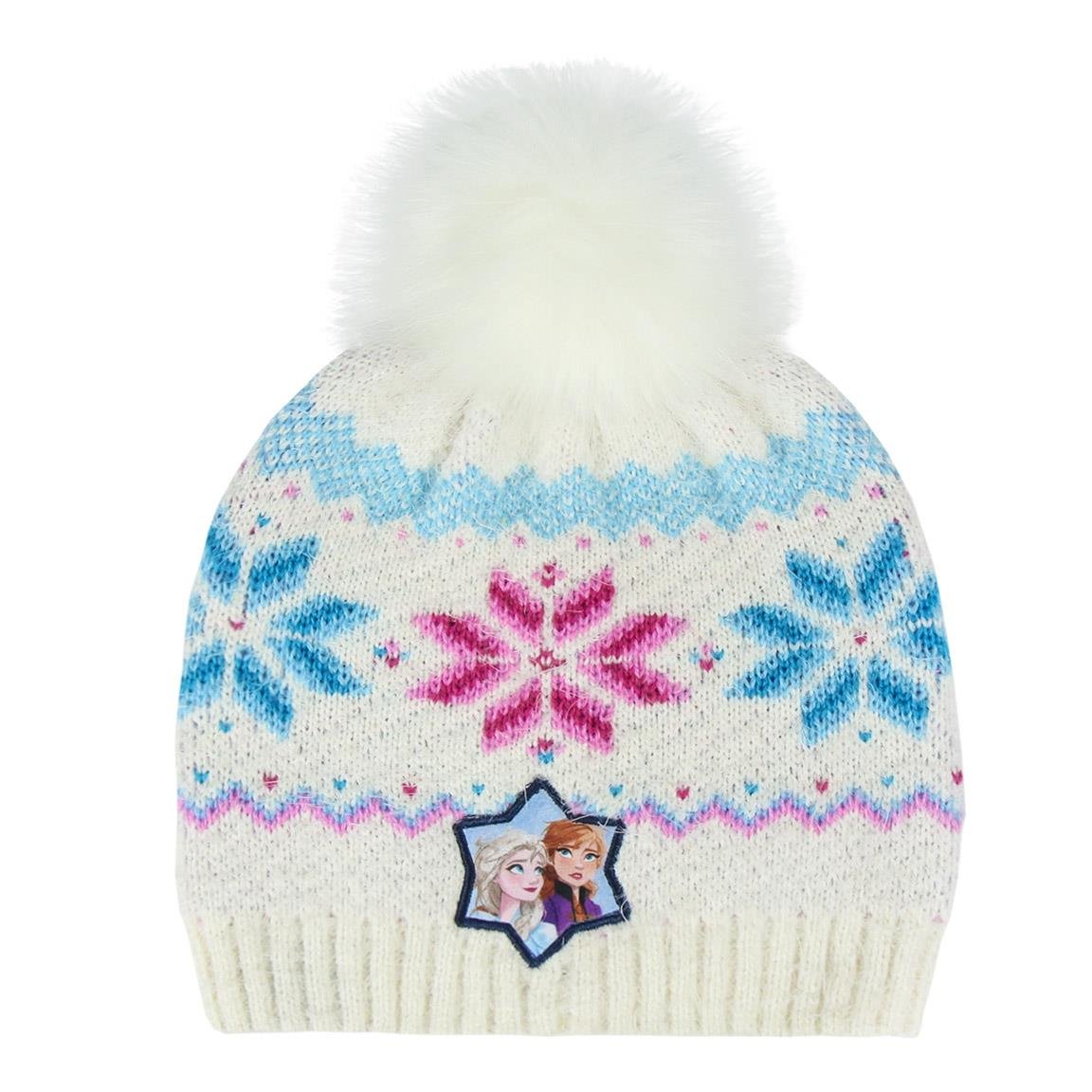 Bílá zimní čepice s bambulí, vánočními detaily a motivem Frozen na přední straně.