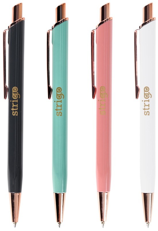 Długopis żelowy Strigo z kolekcji Deco w 4 kolorach obudowy. Wykonany z trwałego, odpornego na uszkodzenia tworzywa. Solidna konstrukcja gwarantuje niezawodność i komfort pisania. Metalowa, elegancka obudowa o subtelnym wykończeniu i złotych detalach. Kwadratowy korpus. Tusz żelowy zapewnia wyjątkową miękkość i płynność pisania. Szybkoschnący i nie rozmazuje się. Kolor tuszu: niebieski.