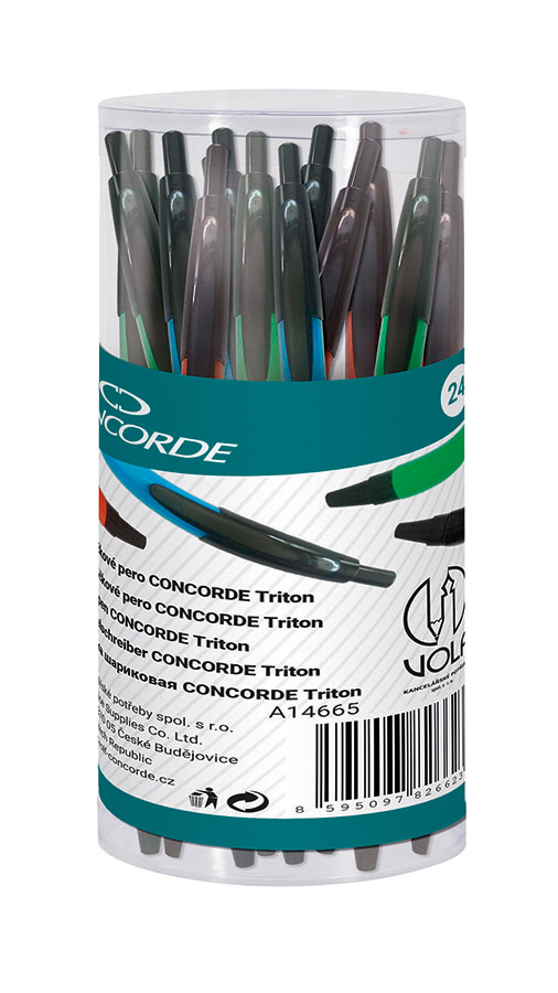 Kuličkové pero s trojbokým gumovým úchopem. Čárový kód na těle. Modrá náplň A3. Šíře stopy 0,7mm. Asort čtyř barev - černá, modrá, zelená, červená. Dodáváno v dóze po 24ks. číst celé