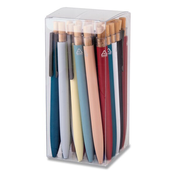 Kovové kuličkové pero Branco z recyklovaného hliníku. Tmavý kovový klip v ozdobné transparentní koncovce, doplněné bambusem. Velkoobsahová modrá náplň. Hrot o šíři 1 mm. Mix barev.