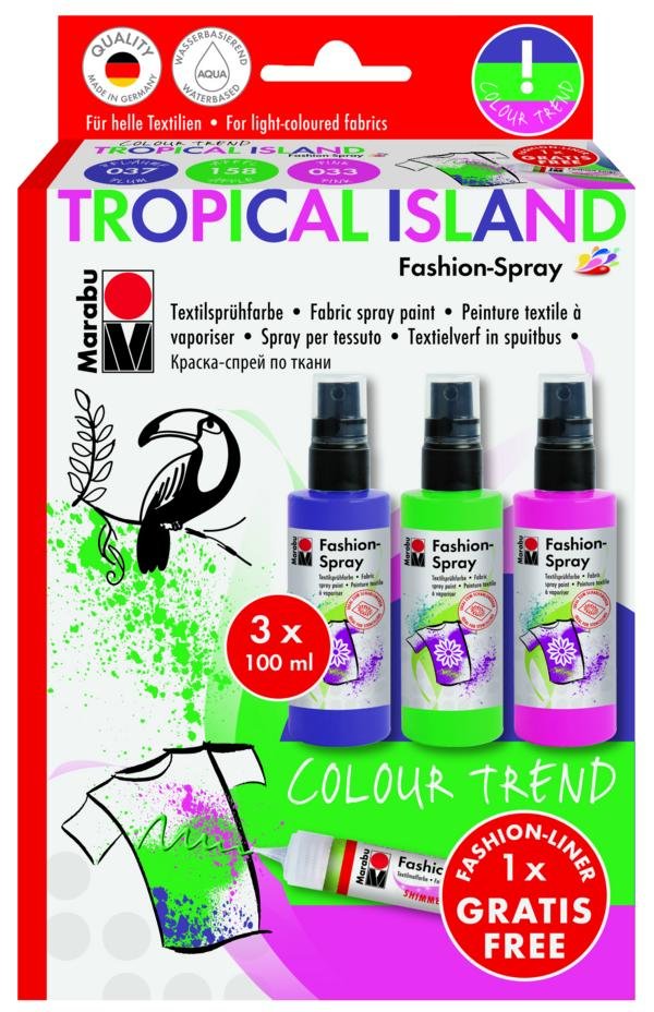 Marabu Fashion Spray Trend Line Tropický ostrov. Probuďte se do exotického jara se sadou trendů Marabu Fashion Spray Trend „Tropical Island“. Módní barevná kombinace dodá vašemu oblečení a domácímu textilu tropický vzhled. V kombinaci s Marabu Fashion Liner můžete vytvořit dokonalé zvýraznění s individuálními ozdobami a skvělými třpytivými efekty. Obsah: 3 x Fashion Spray 100 ml (Pink 033, Apple 158, Plum 037), 1 x Fashion Liner 25 ml (Shimmer-reseda 560)