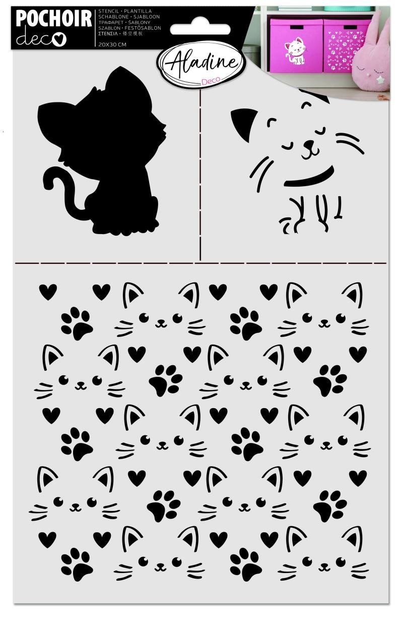 Víceúčelová šablona se skládá z několika částí. První část je tělíčko kočičky, druhá část jsou detaily kočičky a třetí největší část může sloužit jako podkladová šablona. Toto provedení vyniká třeba při zdobení šuplíčků, které jsou vedle se, na přáníčkách můžete využít podkladovou šablonu a kočičku můžete využít jako hlavní motiv, dekorovat můžete textil (trička, tašky, polštáře i závěsy). Použití šablon je velmi snadné a všestranné. Nejdřív naneste barvu na tělo kočičky. Nechte zaschnout. Potom přiložte šablonu s detaily. Použijte kontrastní barvu a detaily vytupujte houbičkou, nebo pomocí špachtle naneste jakoukoliv pastu (vyniká třeba diamantová nebo perleťová pasta Izink). Textilní barvy důkladně zažehlete. Šablonu a další pomůcky ihned po práci umyjte nebo namočte, aby na nich barva nezaschla.