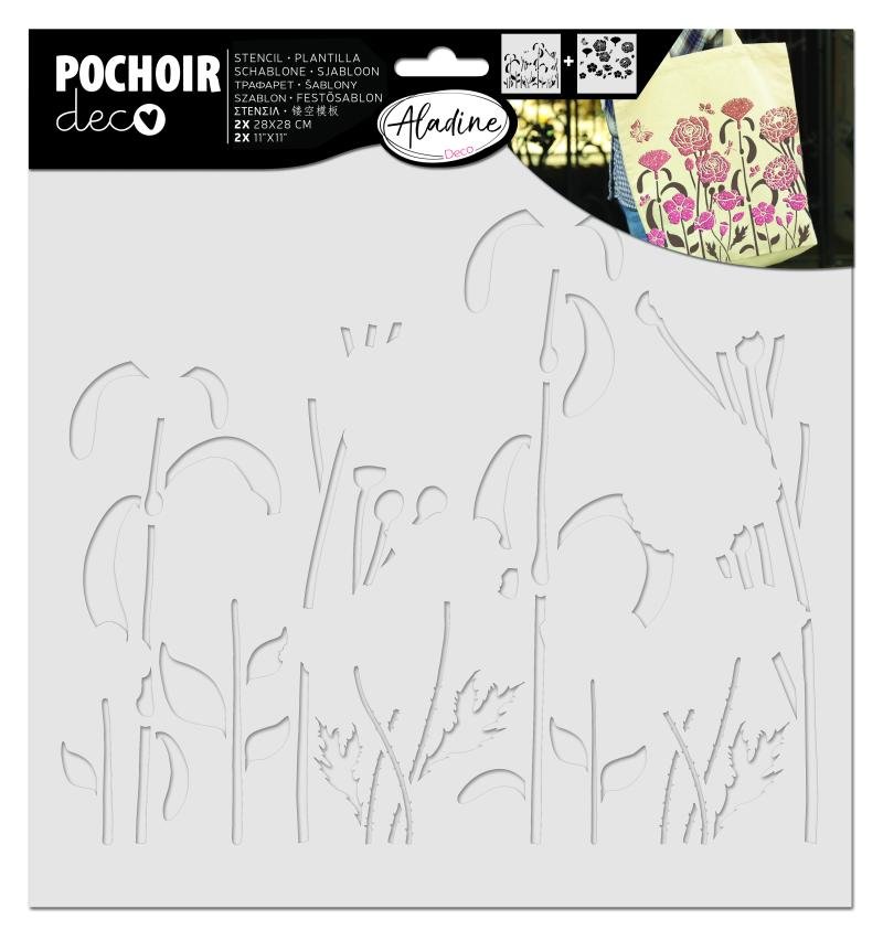 Duo šablona Aladine. Balení obsahuje dvě šablony, pomocí nich vymodelujete vícevrstvý nebo plastický motiv. Šablona se stonkami slouží jako podkladová. Šablona s kytičkami pak dotvoří celek. Pro plastičtější efekt můžete na kytičky použít pasty, které nanesete špachtlí. Pasty mohou být základní, perleťové, diamantové. Pokud dáváte přednost jednodušším projektům, kytičky jenoduše natupujte akrylovou barvu, na textil pak textilní barvu. Textilní barvy důkladně zažehlete.