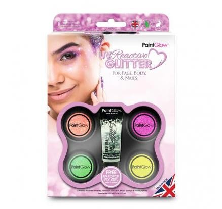 Profesionální třpytky od firmy PaintGlow vytváří třpytivé efekty při líčení a body paintingu. Firma spolupracuje s celebritami, hudební scénou i známými fotografy. Použití: Aplikujte fixační gel na část těla, které chcete ozdobit - můžete třpytkami posypat i pramínky vlasů, či zdobit nehty (Nail Art). Posypte nebo aplikujte třpytky pomocí štětečku. Třpytky odstraňujte pomocí kosmetického ubrousku. Balení obsahuje: třpytky ve čtyřech různých odstínech - balení 3g, fixační gel na třpytky - 13 ml, 2x štětce, paletu na míchání. Barvy jsou vyrobeny ve Velké Británii. Nejsou testovány na zvířatech a jsou certifikovány.