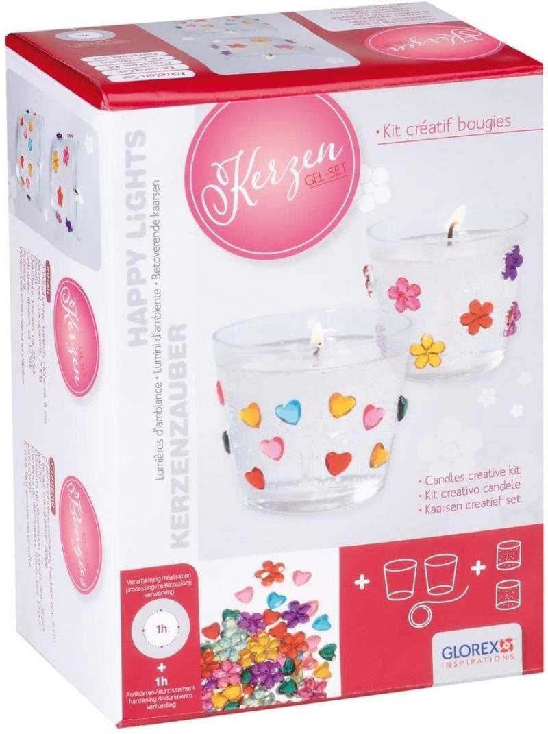 Kreativní sada Candle-Gel candle magic (2 svícny, ozdobná mozaika, gel na svíčky, knot) Krásná sada pro vlastní návrh 2 svícnů. Obsah balení: 2 kónické svícny, výška cca 6 cm, gel na výrobu svíčky transparentní 200 g, knoty, barevné ozdobné díly cca 25 srdíček a 12 květin, návod. Lepidlo na připevnění ozdobných dílů není součástí balení Nevhodné pro děti do 3 let. Nebezpečí udušení, protože malé části mohou být spolknuty nebo vdechnuty.