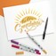 Sada Sunny Lettering Set obsahuje základní výbavu pro lettering s lihovými fixy ABT PRO. V návodu, který je součástí balení, umělkyně Katharina Arends (@letterbraut) vysvětluje, jak pomocí výrobků z této sady vytvářet nápisy s monochromatickými efekty i pestré barevné přechody. Balení obsahuje: 3x lihový oboustranný fix Tombow ABT PRO, 1x oboustranný štětcový fix Fudenosuke, 1x návod (EN, DE, ES, FR, IT)