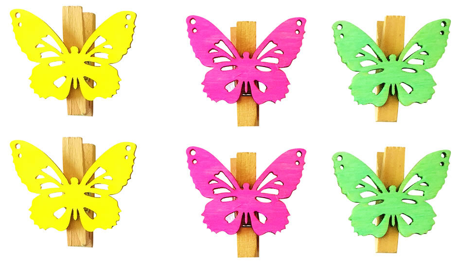 Dřevění motýlci v jarních barvách. Díky kolíčku se dají všestranně použít, například krásně ozdobí jarní věnce. číst celé