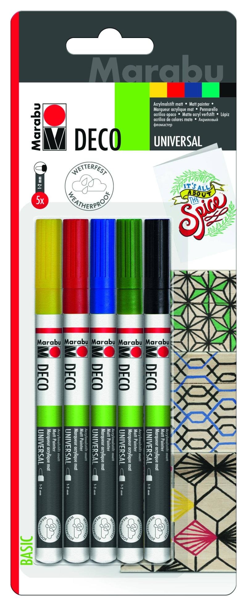 Marabu akrylový popisovač 5 x 1-2 mm Vše je možné u Deco Painter. Tento matný akrylový popisovač má vysokou úroveň krytí a je ideální pro všechny savé povrchy. Barvy jsou světlostálé a odolné vůči povětrnostním vlivům, takže jsou skvělé pro venkovní dekorace. Popisovač je také ideální pro děti, protože je na vodní bázi a rychle schne. Sada 5 obsahuje barvy Sunshine Yellow, Cherry, Mint, Lapis a Black. Obsah: 5 x Deco Painter 1-2 mm (Sunshine yellow 220, Cherry 125, Mint 153, Lapis 143, Black 073)